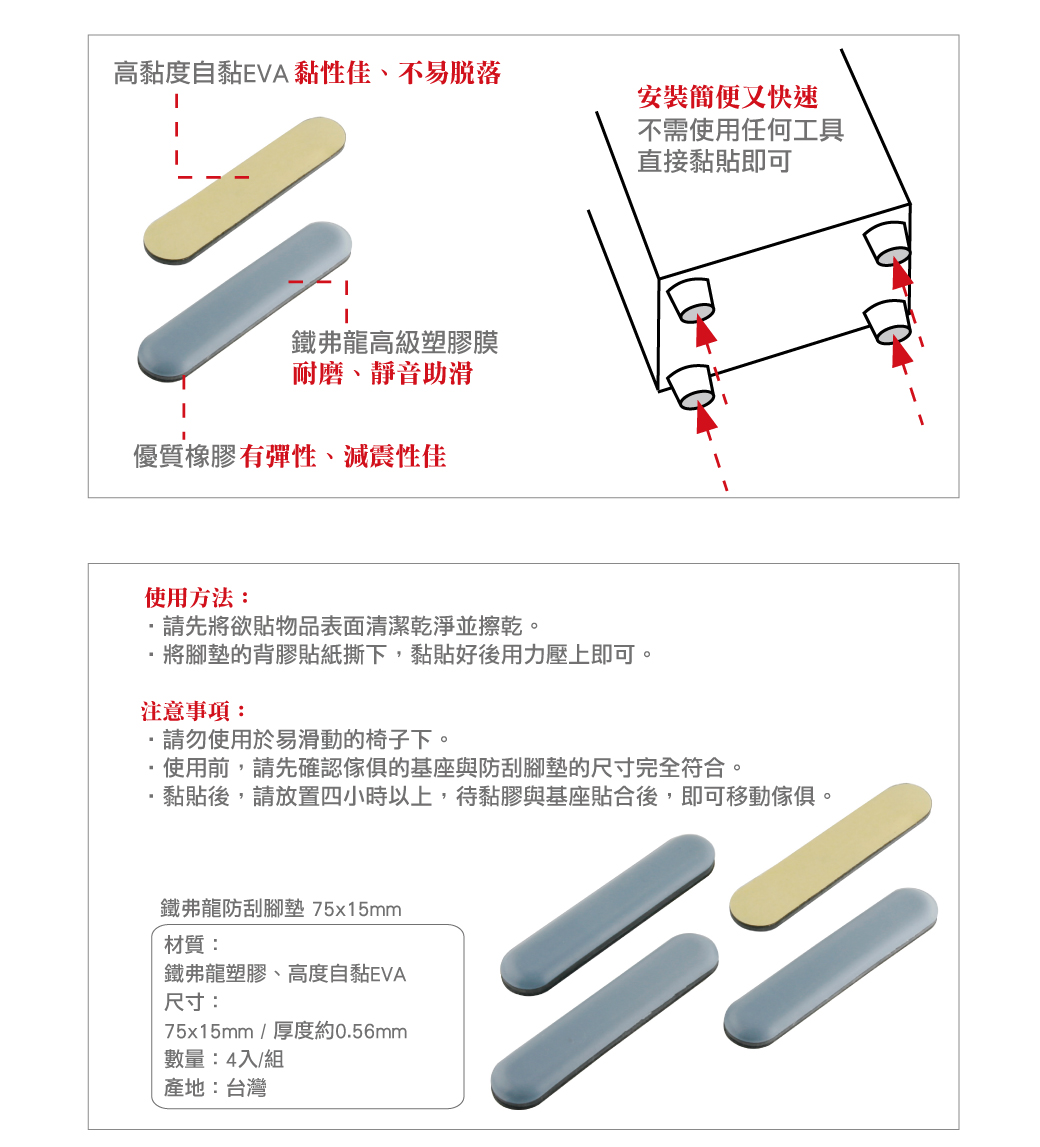 防刮耐磨家俱電器鐵弗龍防刮腳墊-75x15mm_4入
