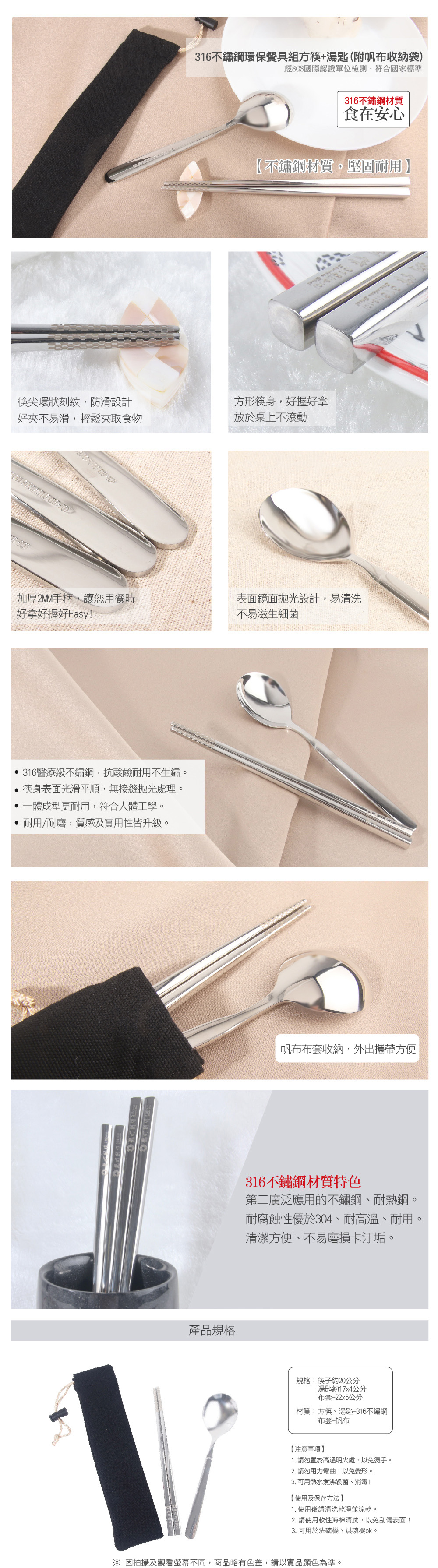 材質:方筷、湯匙-316不鏽鋼、布套-帆布
